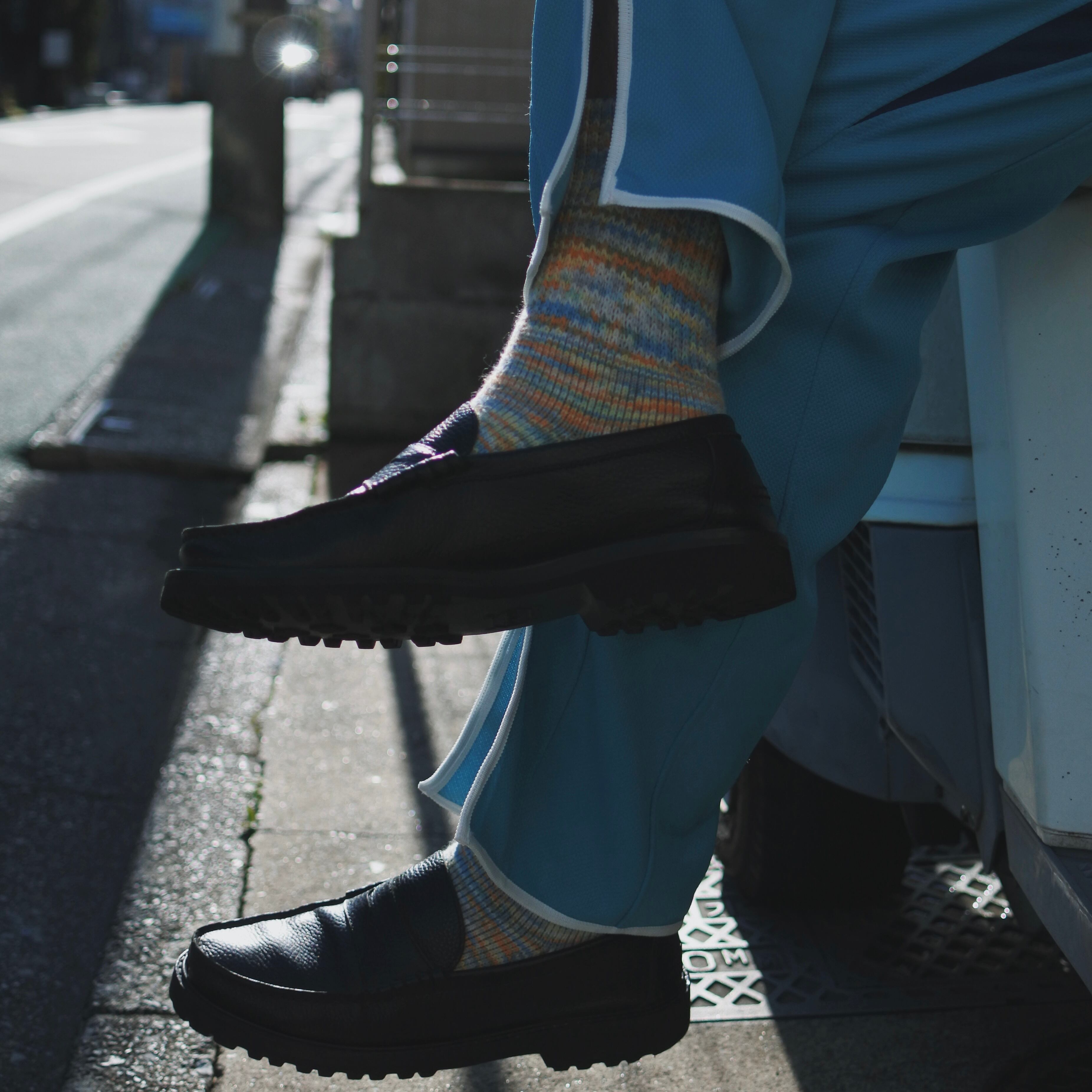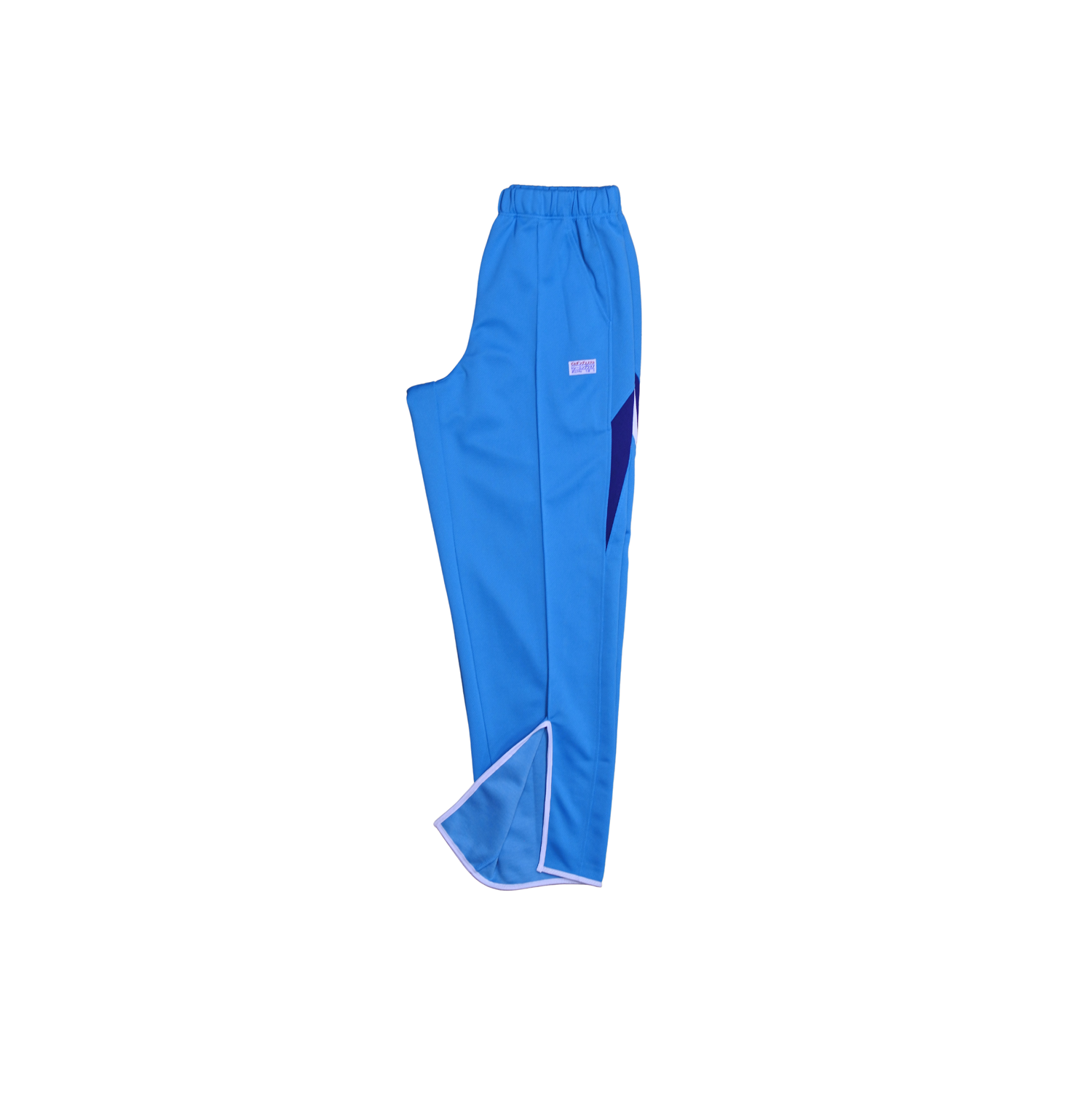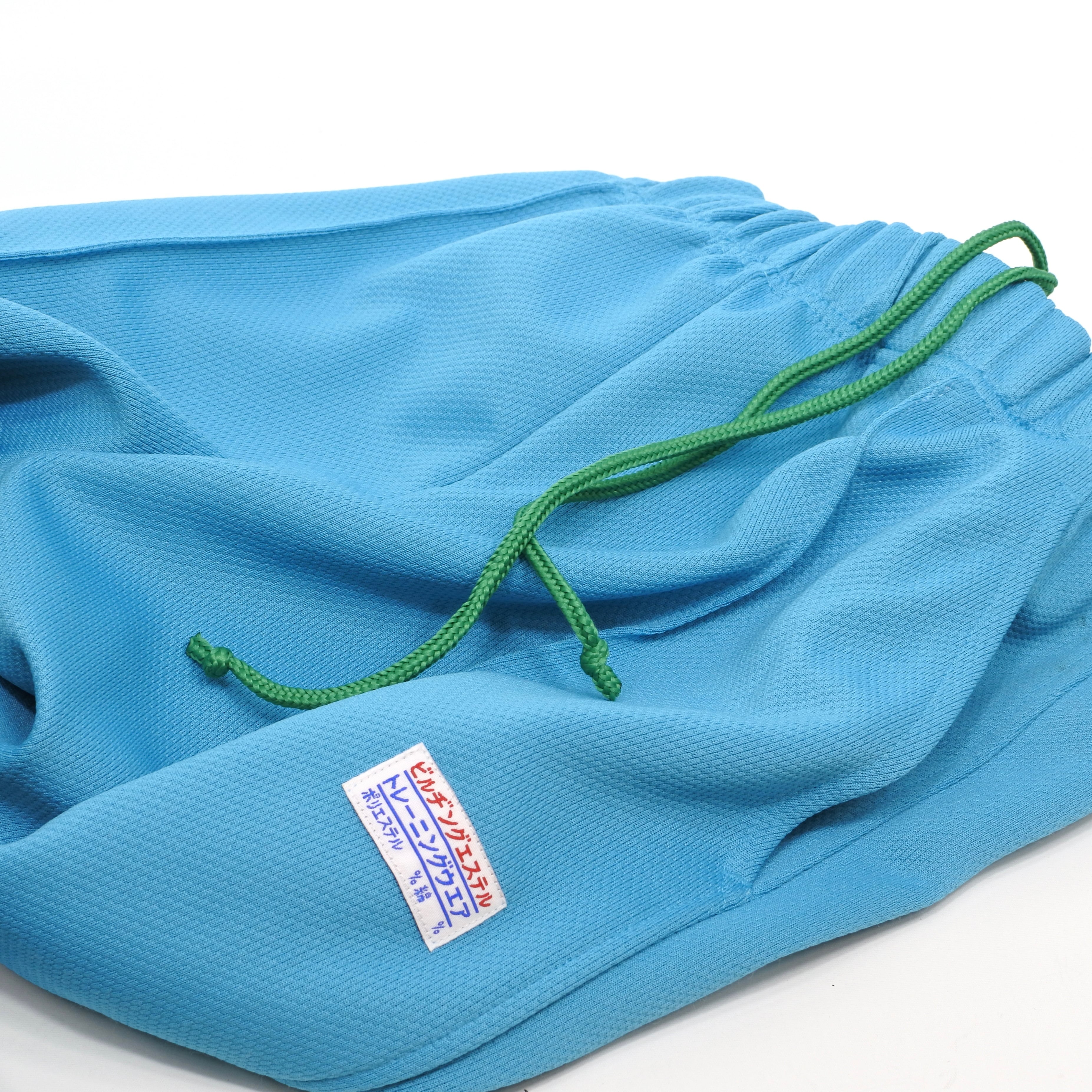 株式会社レイバン製、契約満了となり製造終了した在庫処分品の学校指定ジャージをベースとして使用させて頂きました。本来、特定の学校の生徒が体育の授業で着用するものです。センタースリットを施したフレアパンツ風。靴と靴下のコーディネートまで存分に発揮されるかなといった具合です。裾はバインダー仕様、フレア風と言えどもそもそもパンツ自体が多少ゆとりのあるシルエットの為、好みが分かれる点も軽減され、どなたでも履きやすいかと存じます。